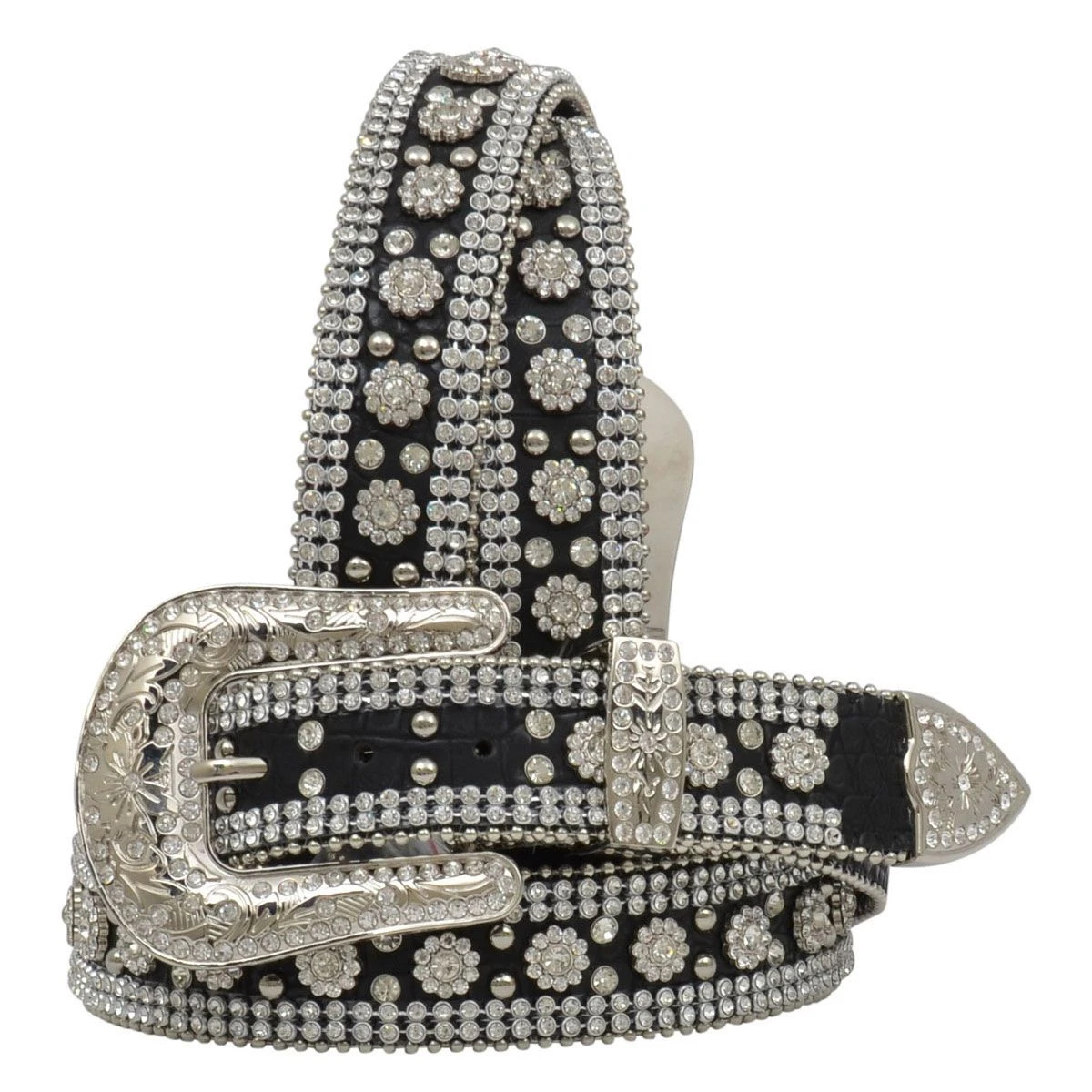 Add a dash of sparkle and shimmer with the Angel Ranch Gator Print and Flower Crystal Stud Belt. Finished with ball chain edging and flower-shaped clear crystal conchos and studs, complete with a dazzling rhinestone encrusted silver buckle, this belt is meant to dazzle and stand out! Removable silver buckle allows for multiple looks, adding your favorite buckle for a more personalized look.