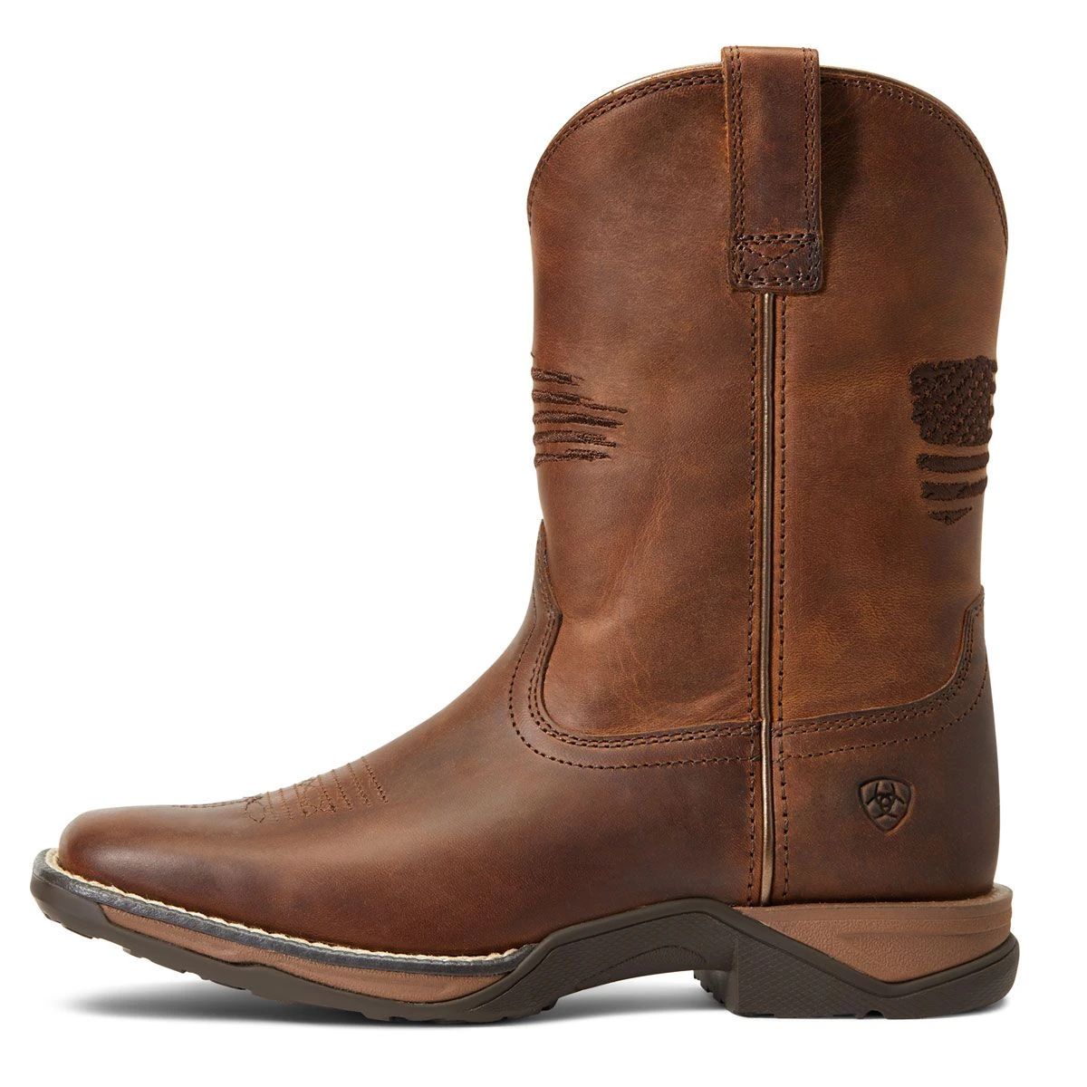The Ariat Anthem Patriot Youth Western Boot features all of the great qualities of the Anthem line- in a youth size! This stylish, upgraded and rugged Western boot is equipped with waterproofing to keep your feet dry all day! Its bold 5 row stitching on the upper makes a statement with the American flag embroidery! It has an inner mesh lining to prevent your feet from overheating.