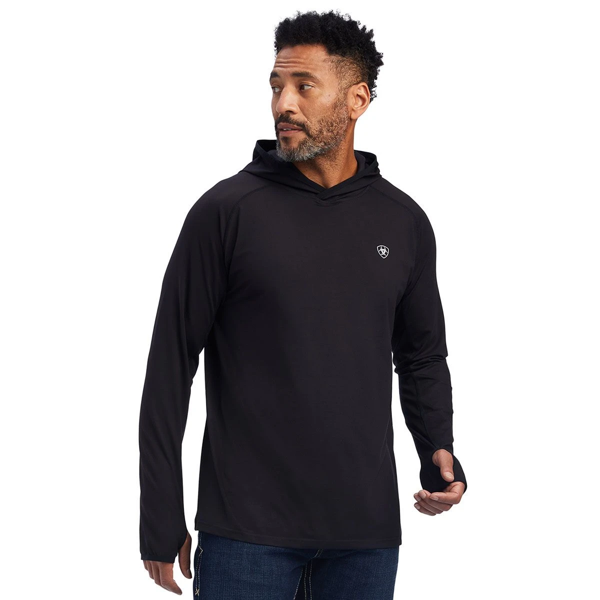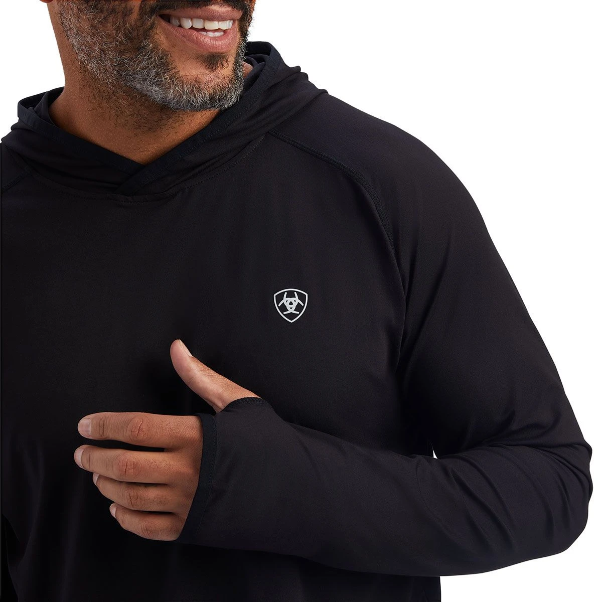 The Ariat Cornell Hooded Mens Baselayer is constructed of lightweight, technical fabric that wicks away sweat and provides superior comfort with Ariat’s Moisture Movement Technology. The attached hood provides optional protection against the sun or elements, and thumb-holes in the sleeves keep them from riding up while working.