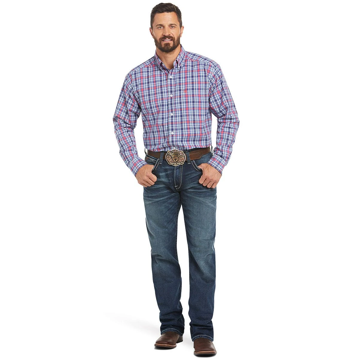 The Ariat M4 Low Rise Stretch Adkins Boot Cut Mens Jeans are a modern take on a classic style. The comfortable and durable 99% Cotton/1% Spandex 13 oz ring spun stretch denim is relaxed through the waist, hip and thigh. These jeans fit lower on the waist, and have anchored belt loops and a no-rub comfort inseam. The heavy-duty zippers and hardware and extra deep front pockets are made to handle the work day. With a classic boot cut, these jeans look good on anyone.