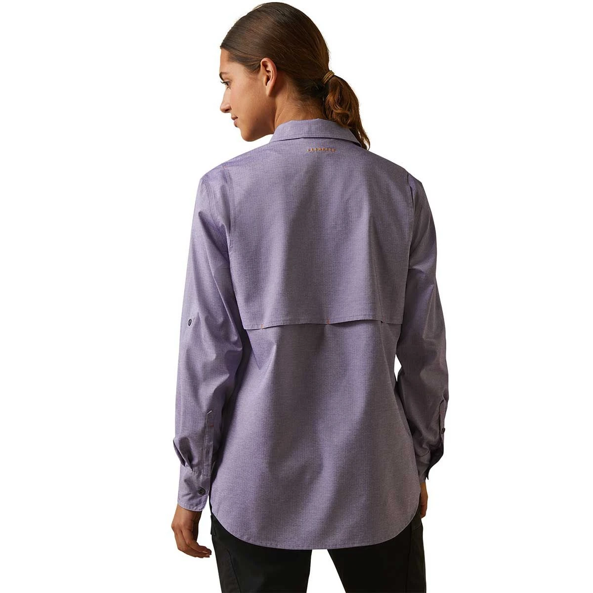 The Ariat Rebar VentTek DuraStretch Button Down Ladies Long Sleeve Work Shirt is full of features to make your day more comfortable. The 4 oz DuraStretch cotton fabric is rip-proof and durable with roll tab sleeves with a button closure. The vented back panel with mesh lining keeps you cool and comfortable no matter the weather. This shirt features a classic button down front with metal buttons with two button chest pockets, and has adjustable cuffs. It has a loose-fitting drape that is still feminine, and has a drop tail hem for better coverage.