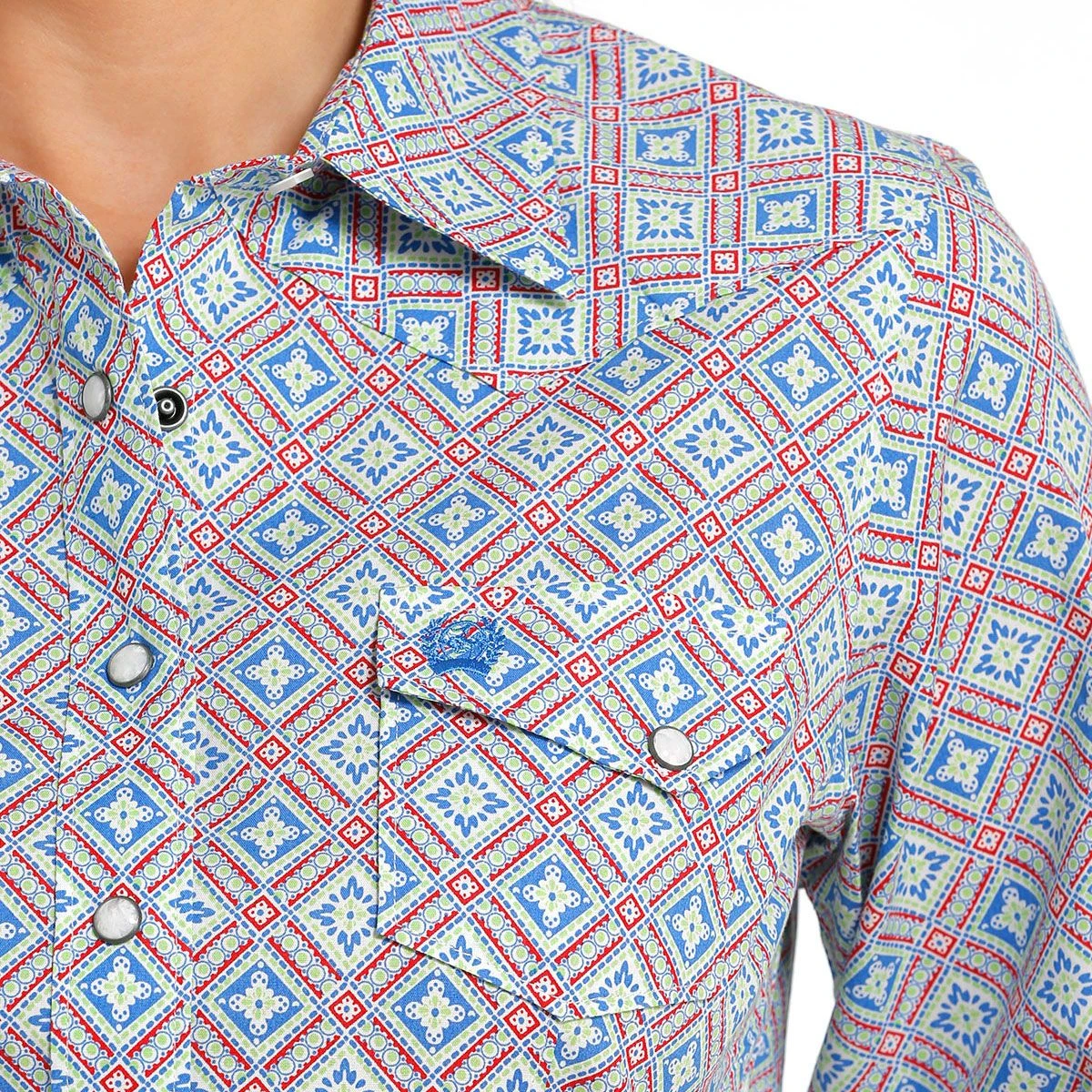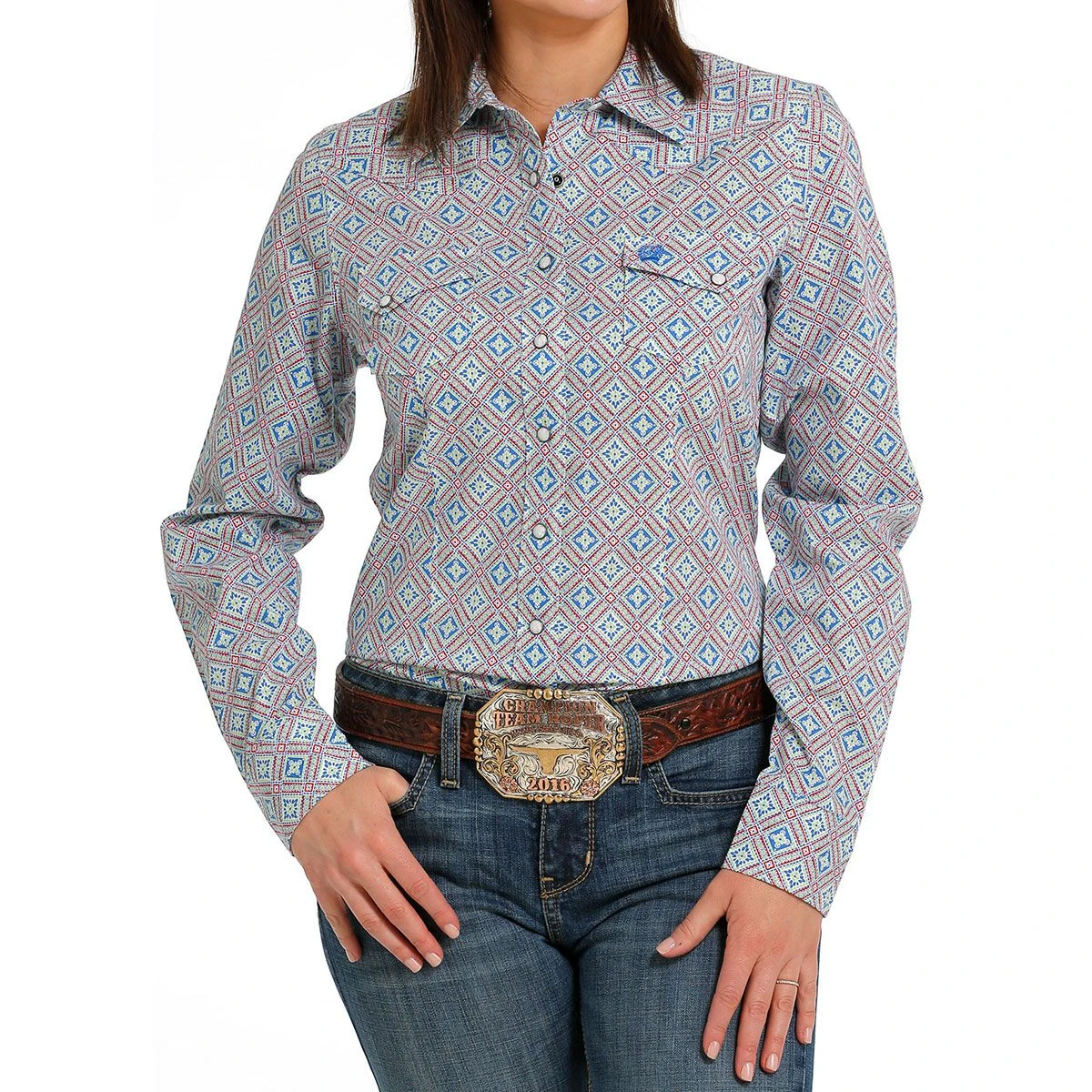 The Cinch Blue Squares Ladies Western Shirt is a printed cotton plain weave long sleeve button down. The red and light blue diamond pattern gives this shirt a bit of a lavender appearance, and the white marble snaps provide a nice contrast. This shirt is professional and feminine and is appropriate for multiple show rings.