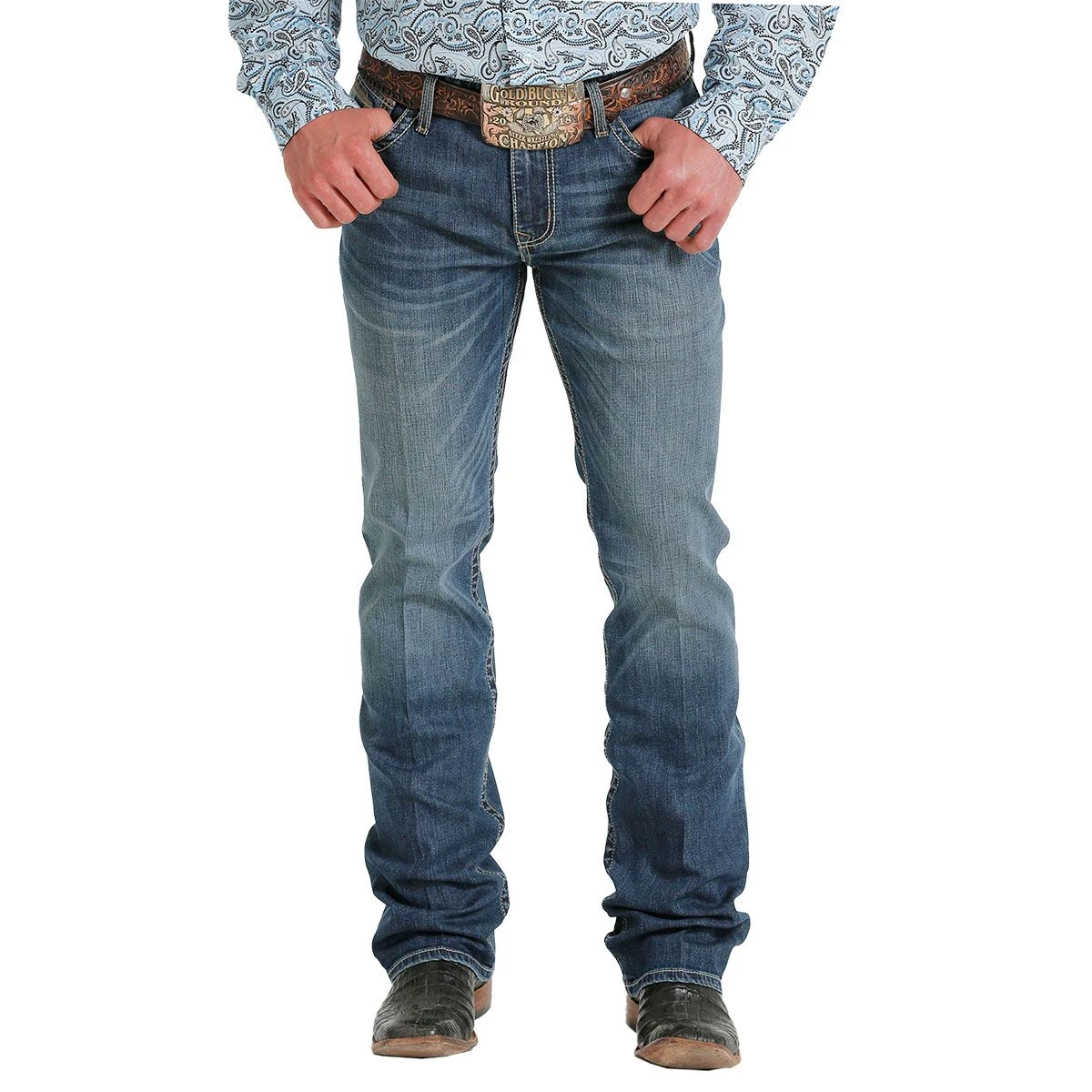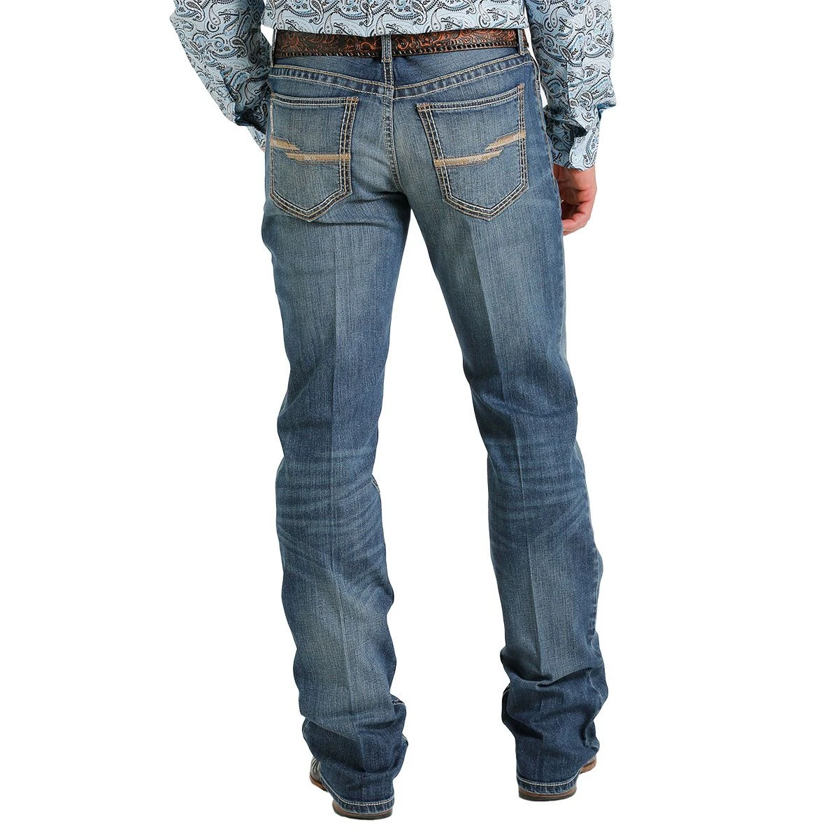 The Cinch Ian Dark Stonewash Mens Jeans are a mid rise, slim, boot cut jeans in a dark stonewash that is attractive and versatile. The 10.2 oz performance stretch denim features heavy finishing details including tint, hand sanding, whiskers, chevrons and knee starbursts for a combination of style and comfort. The back pocket embroidery details and unique, yet still subtle. These jeans can be worn dressed up or down, in the saddle or out.