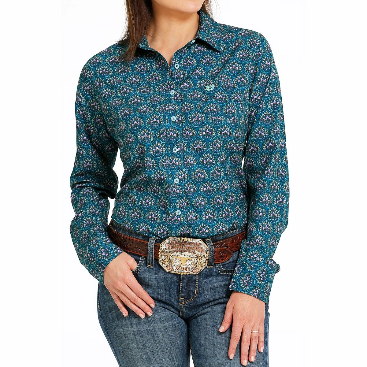 The Cinch Teal Paisley Arenaflex Ladies Western Shirt is a lightweight poly-spandex long sleeve button down in a teal and purple floral print with teal-white marble pearl buttons. This shirt is perfect for hot weather and is moisture wicking and quick-dry.