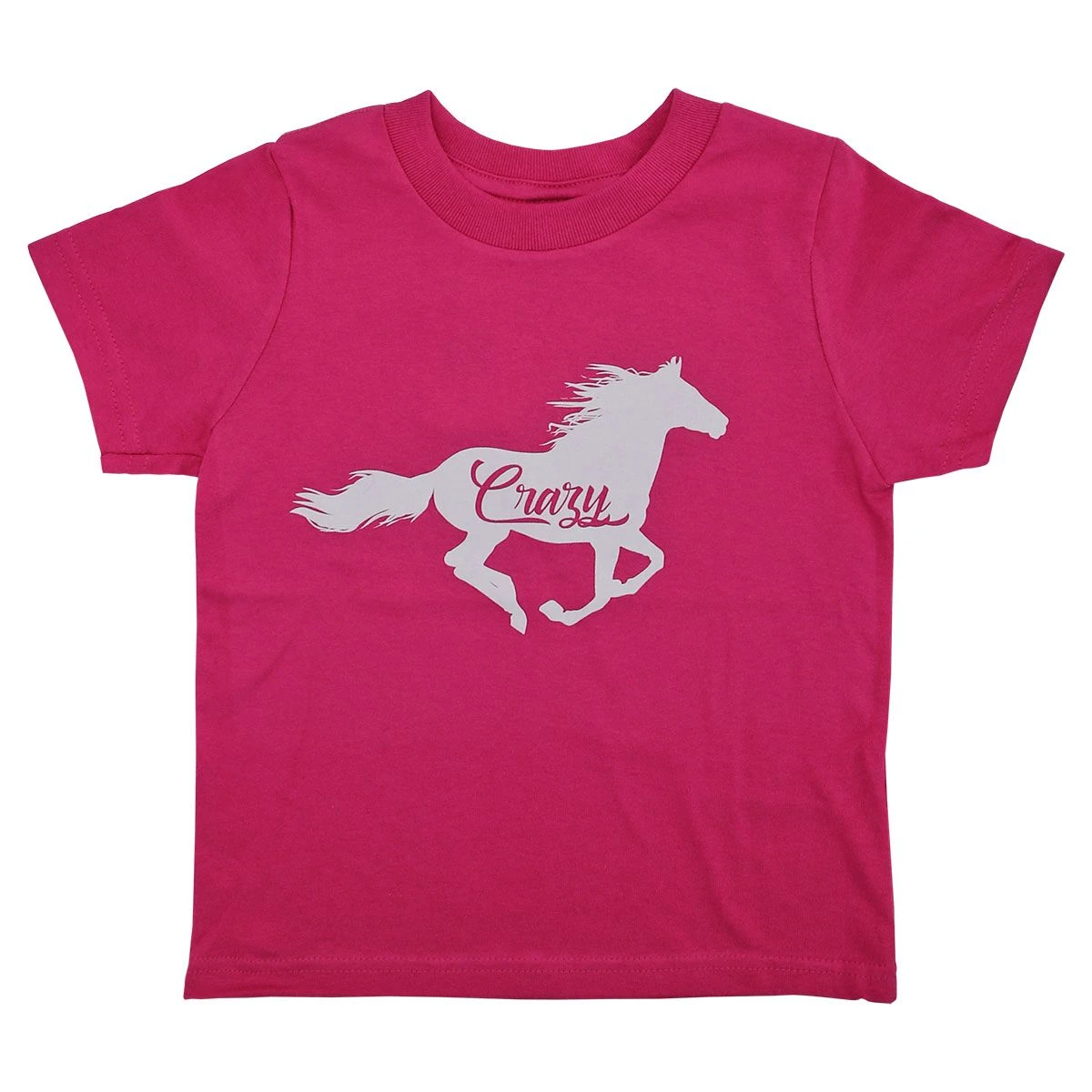 Horse Crazy Girls Tee is perfect for your little cowgirl! Screen printed running horse with “Crazy” scripted letters make a sweet gift for your favorite equestrian! Teach her its good to be a little crazy in this short sleeve tee made to be worn for school, play, or during chores at the barn.
