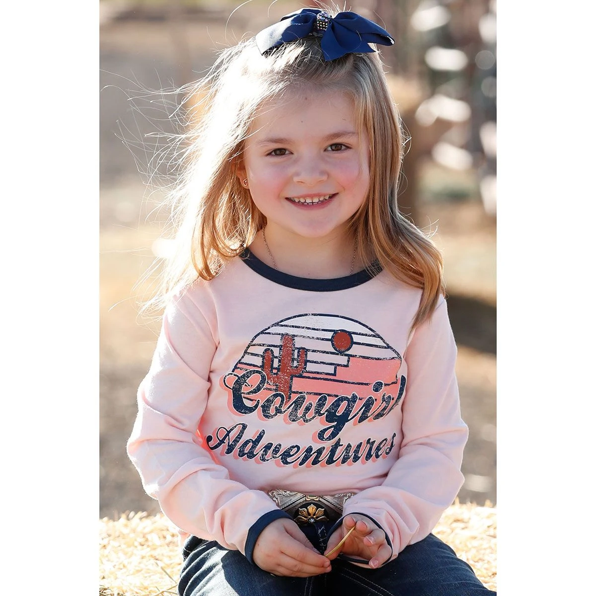 The Cruel Girl Cowgirl Adventure Tee will be your little girls Fall go to. Featuring a soft pink base with navy blue accents and a large desert scene print. Stay comfy and cozy with the comfort of a cotton-poly blend tee. Pair with a Cruel Girl western top to complete the look.