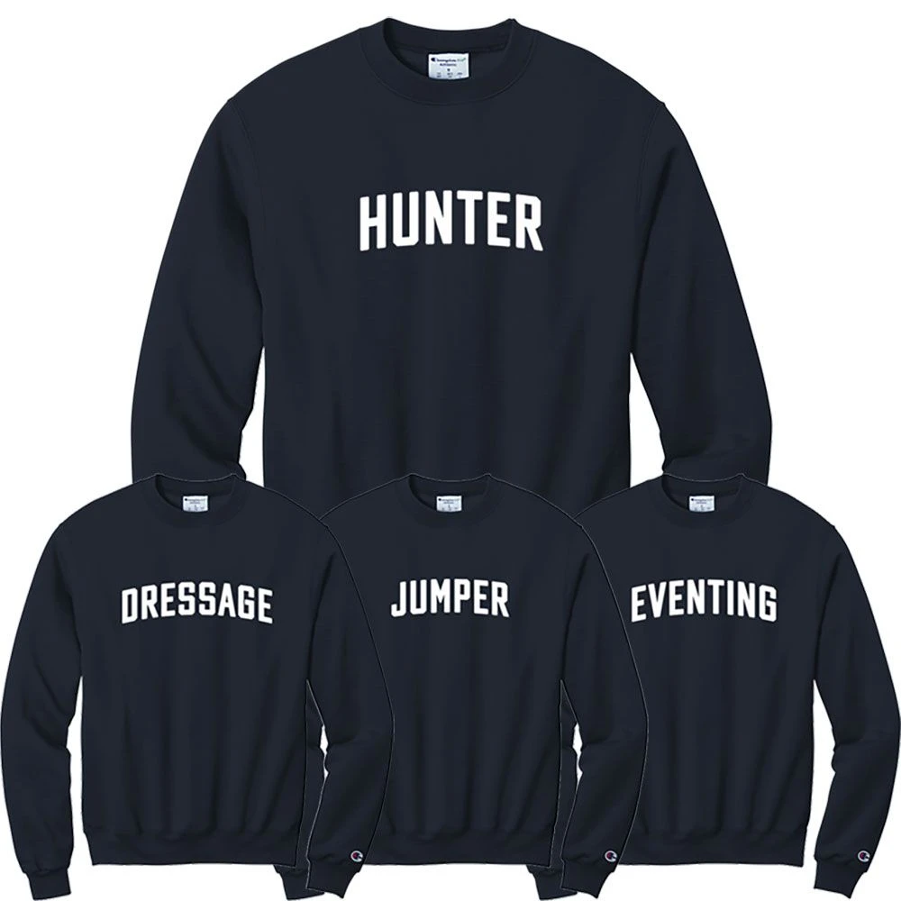Custom crewneck sweatshirt by Big Dee’s Custom Equine Shop. This cozy sweatshirt is made out of 50/50 cotton/poly blend and has double dry technology to wick away moisture. Great for days at the barn or just lounging around. Customize this sweatshirt with your favorite equine discipline in white lettering across the front.