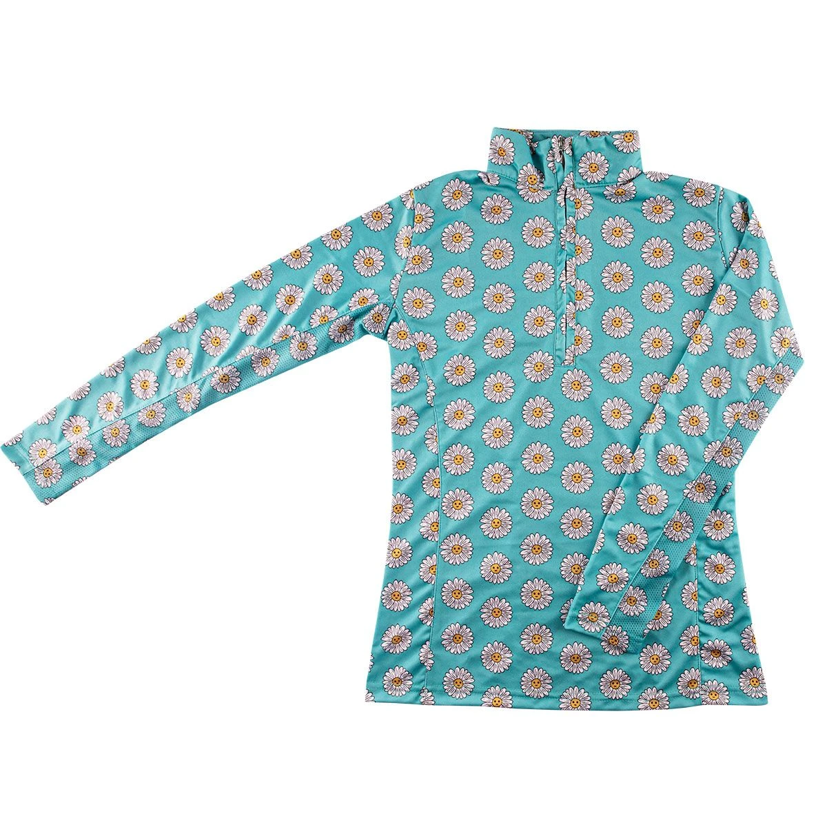 The Daisy Doodle Girls Quarter Zip is cool, breathable and comfortable for all day barn wear. This fun sunshirt features happy daisies on an aqua base quarter zip style. A mesh yoke across the back and under the arms is perfect for breathable sun protection and moisture wicking material.