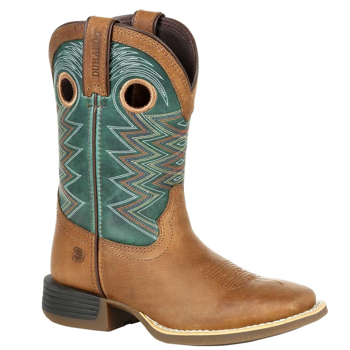 Durango Lil Rebel Pro Kids Western Boots feature a fun pop of tidal teal color on the upper with attractive western stitch along the shaft, a classic wheat color foot, top trim and pull tabs. This durable boot offers soft mesh lining and cushion flex insole for all day wearing comfort for your young cowpoke perfect for riding and every day wear.