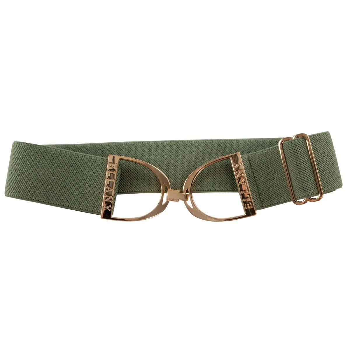 Ellany Moss 2″ Gold Stirrup Elastic Ladies Belt features a two inch wide moss elastic band accented by an attractive gold stirrup buckle. Ellany Equestrian Elastic Belts are designed so that one size fits most, easily adjusting from 24 inches to 65 inches by moving the slider to achieve your perfect fit. These stretchy elegant belts feature a stunning buckle in equestrian design and come in beautiful colors and patterns. Designed to compliment any outfit these uniquely styled belts are flattering in breeches, slacks, jeans – anywhere you find beltloops – ensuring that there is no gap in the back and no bulge at the buckle. So comfortable, Ellany belts are a must have addition to any wardrobe!