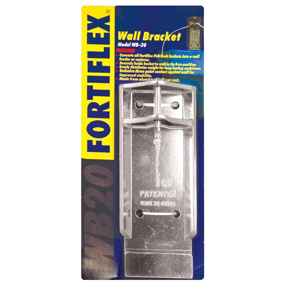 WB-20 Aluminum Wall Bracket for water Buckets. This patented aluminum bracket is specially designed to hold flat back buckets securely against a wall or post, indoors or outdoors. Top pin holds the bucket handle against the wall, while a lower bracket catches the flat back bucket lip to further secure it to the wall.