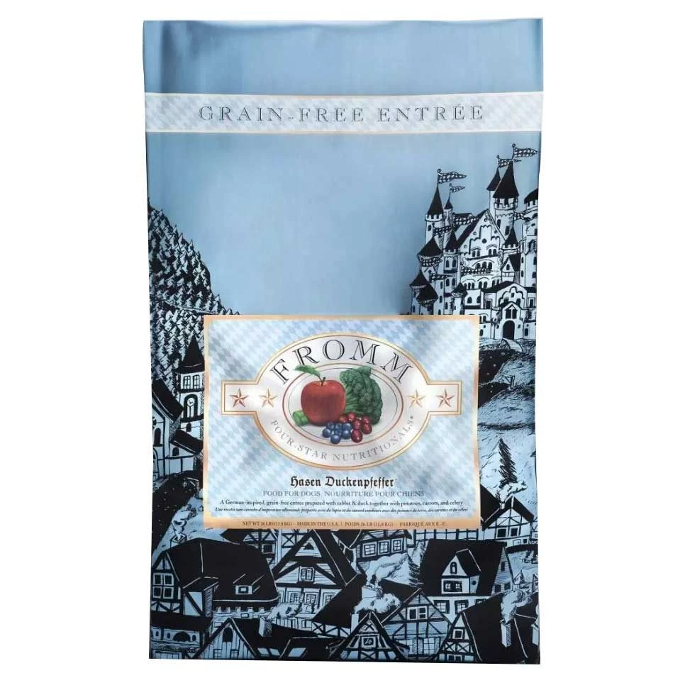 Four Star Hasen Duckenpfeffer by Fromm is a German inspired, grain Free dry dog food that your dog will surely love! Made with rabbit & duck along with potatoes, carrots and celery make this a high protein, grain free meal.