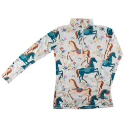 The Garden Pony Girls Quarter Zip is cool, breathable and comfortable for all day barn wear. This fun sunshirt features multi colored carousel ponies with flowers on a light blue base quarter zip style. A mesh yoke across the back and under the arms is perfect for breathable sun protection and moisture wicking material.