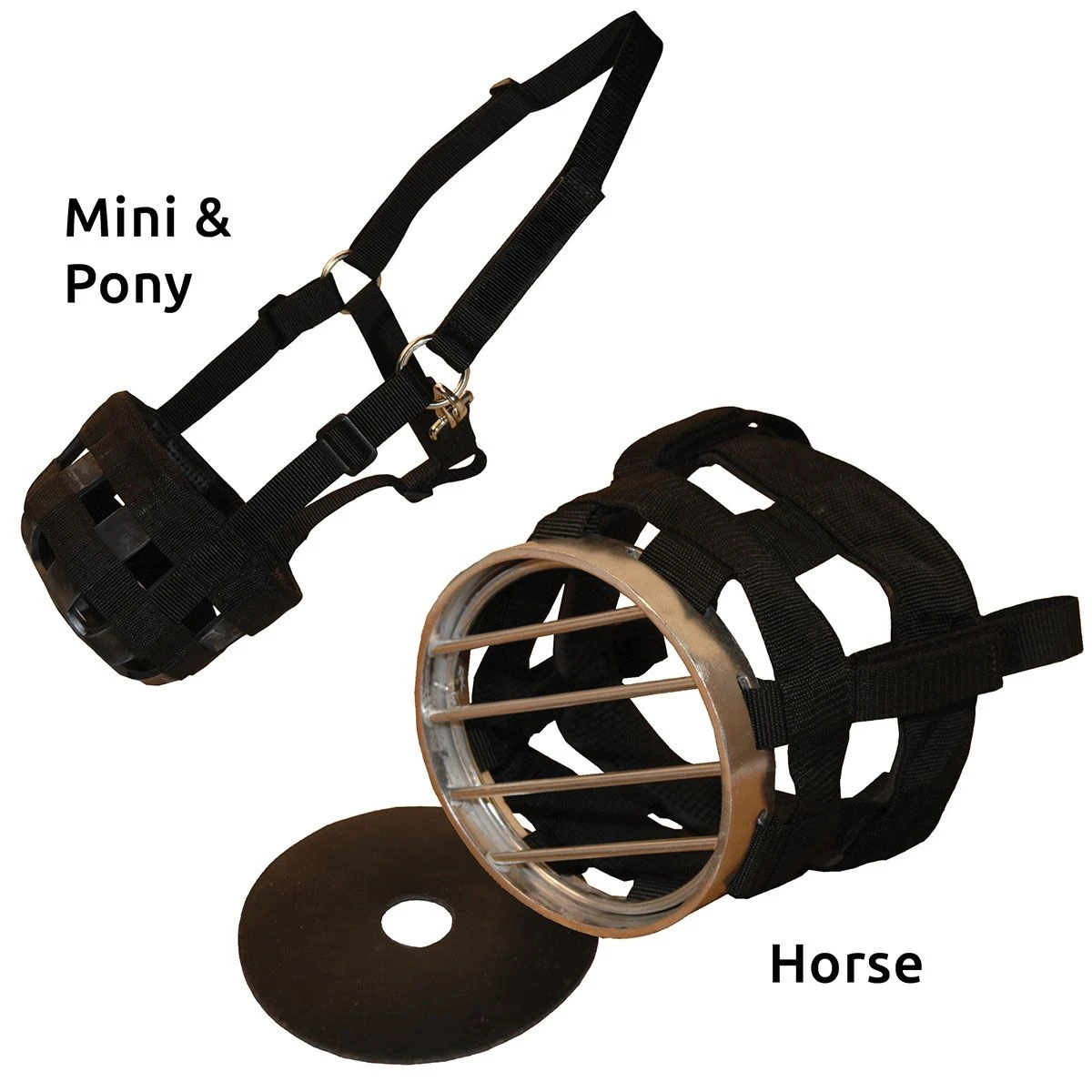 Grazing Cribbing Muzzle. Designed to help prevent cribbing, overgrazing, wood chewing or biting. Attaches to halter with 4 way hook and loop adjustment system. Padded noseband and grill bottom allows horse to drink and eat at a limited pace. The nose is lined with textured neoprene to prevent heat buildup and rubs.