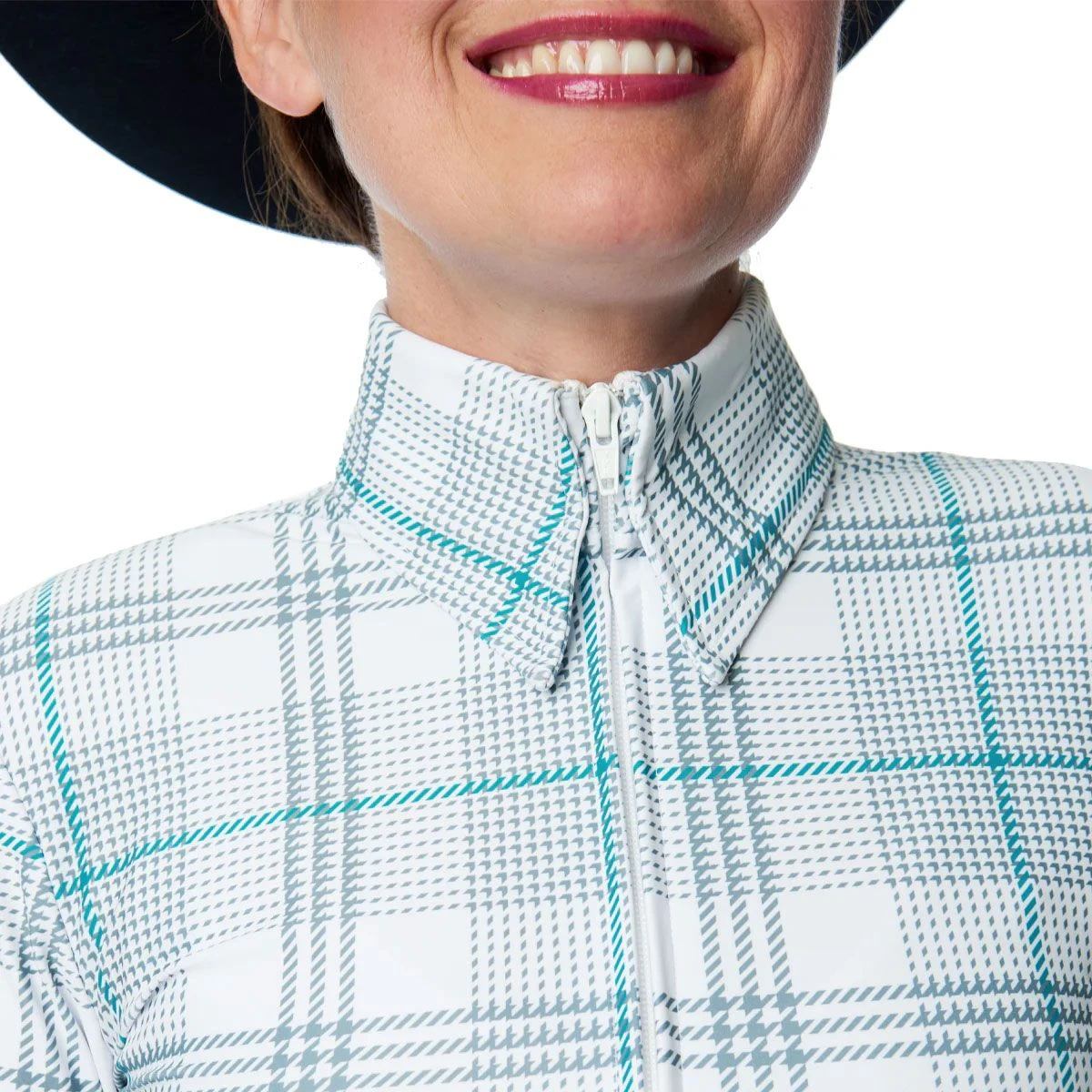 The Hobby Horse Glenna Show Blouse is made of a technical fabric that maintains its shape and brightness without being see-through. The white base features a teal and gray plaid gingham pattern, and the fabric is soft against the skin and moisture wicking. A white front zipper subtly blends in to the fabric. This versatile show shirt can be matched back to an array of saddle pads and chap colors, giving you plenty of options to complete your show look.