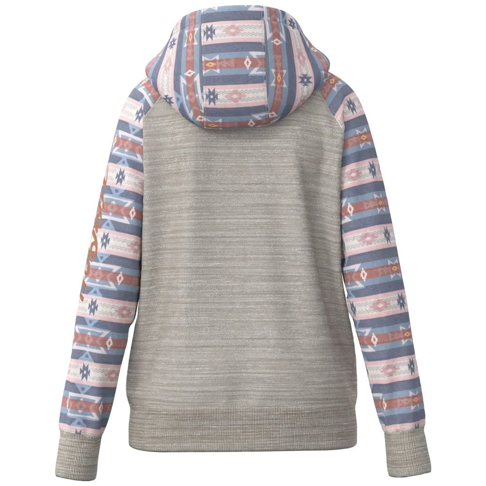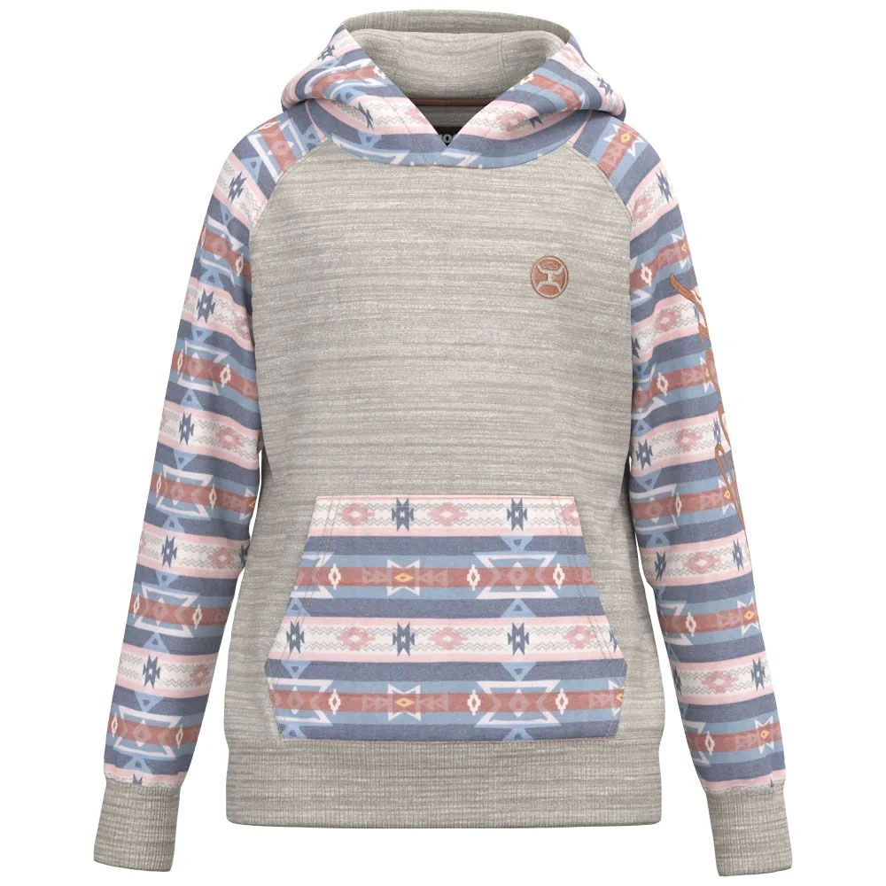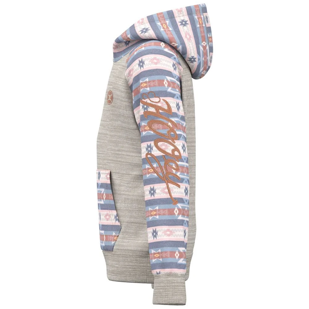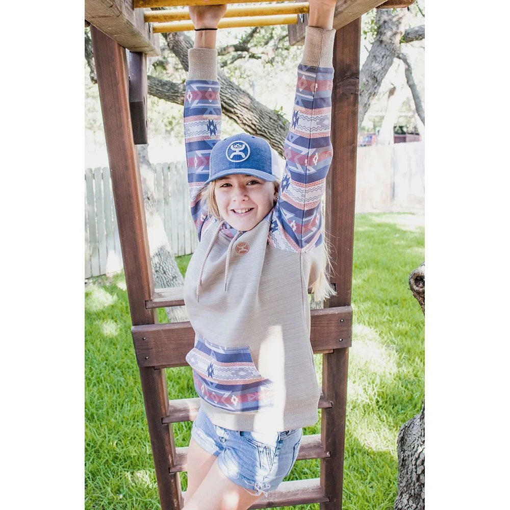 They Hooey Summit Space Dye Aztec Girls Hoodie is comfortable and soft. Crafted from high quality signature soft material, this hoodie features a double lined hood and reinforced cuffs and waistband for all day durable wear. In a fun and bright serape color on the pocket, hood and sleeves there is a signature Hooey logo on the front and embroidered down the arm.