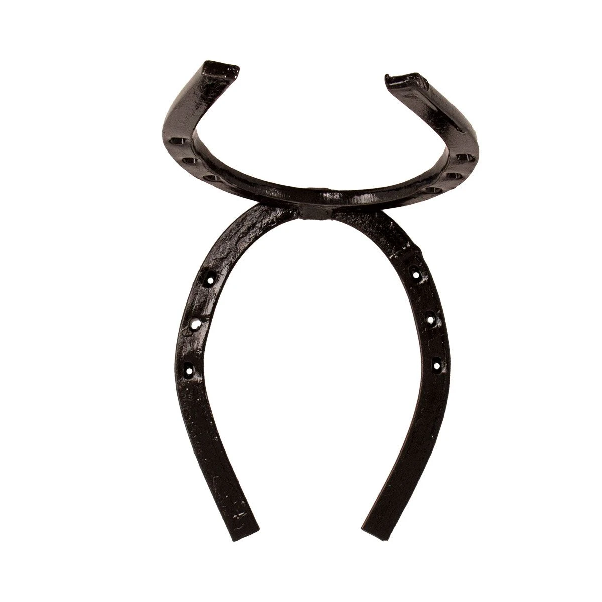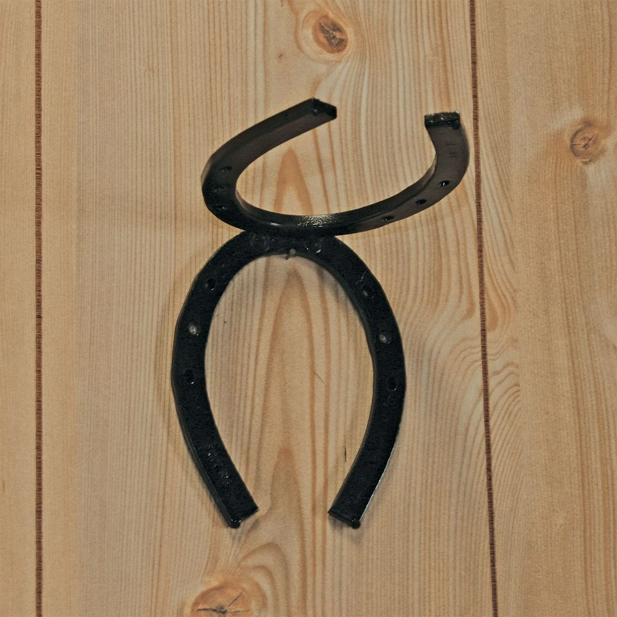 Great way for hanging brooms, shovels and rakes to keep your barn neat and tidy. Double horseshoes coated in black paint mounts securely to the wall of your barn to keep barn utensils up and out of the way.