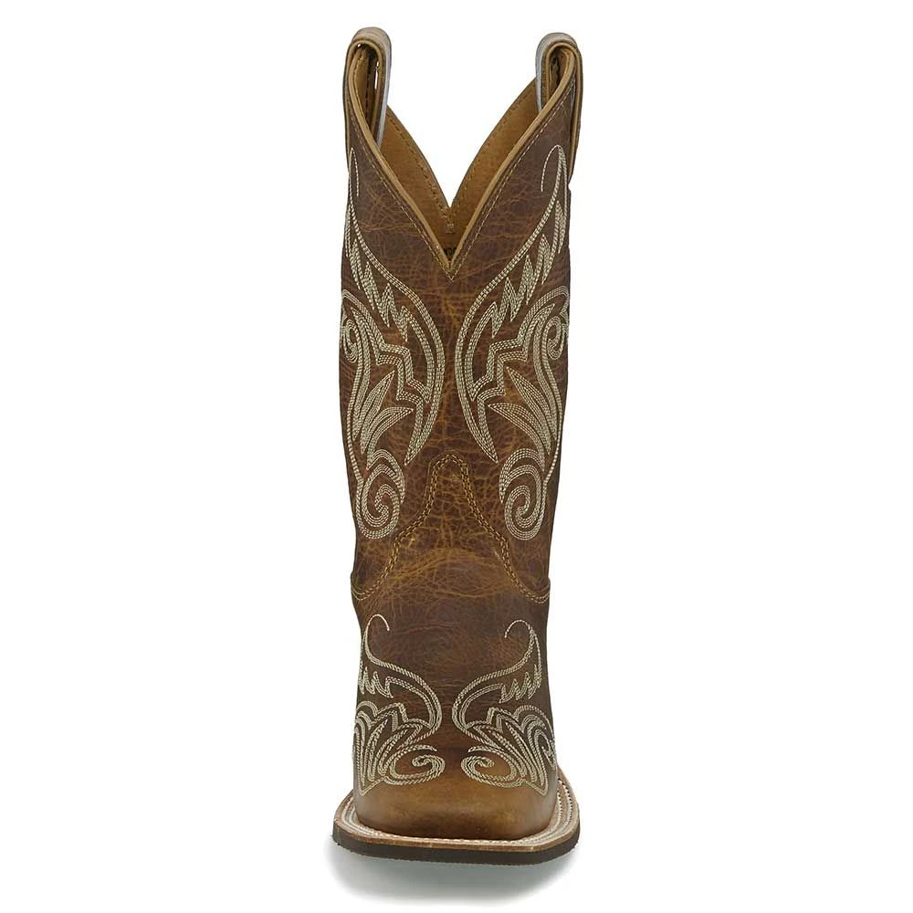 Justin LLano Ladies Western Boot embraces the Old-West spirit with modern Cowgirl elements! The 11-inch tall boot is made from distressed tan leather and accented by bold stitch patterns on both the upper and foot, a whimsical almost butterfly-wing like effect. This classic western boot is built for comfort with a broad square toe, standard heel, and J-Flex Flexible Comfort System insoles with a cushioned horseshoe midsole for maximum support. Perfect for work, play, riding, and everyday living, experience the proven quality and craftsmanship Justin Boots offer.