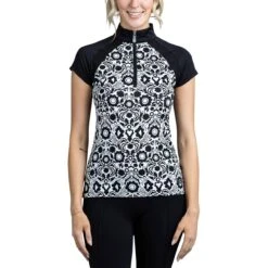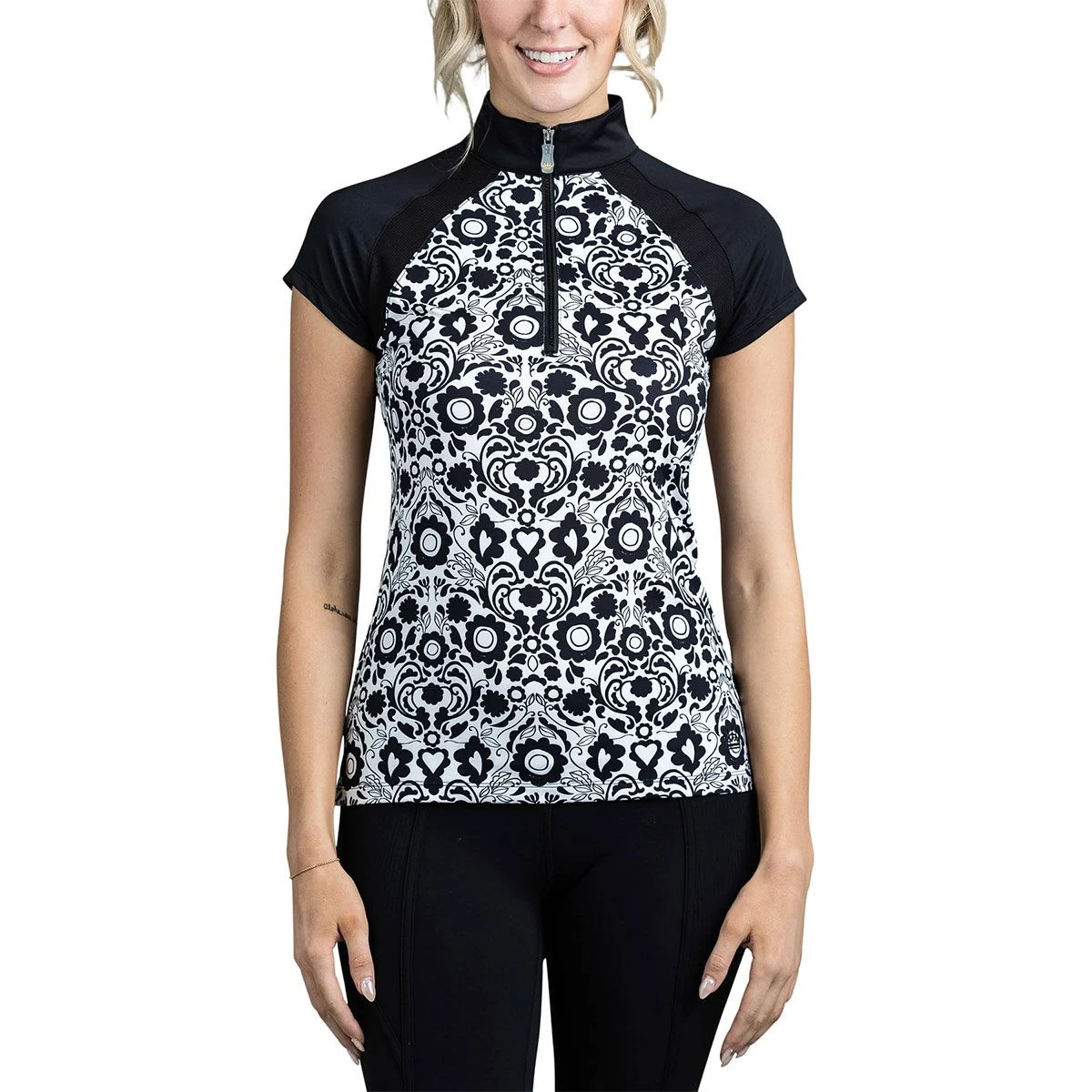 The Kastel Denmark Black & White Floral Short Sleeve Ladies Quarter Zip features a beautiful pattern that can go from the barn to town with ease. The solid black short cap sleeves compliment the feminine pattern throughout the body. The lightweight fabric provides 30+ UPF sun protection.