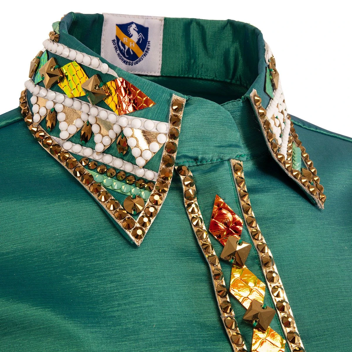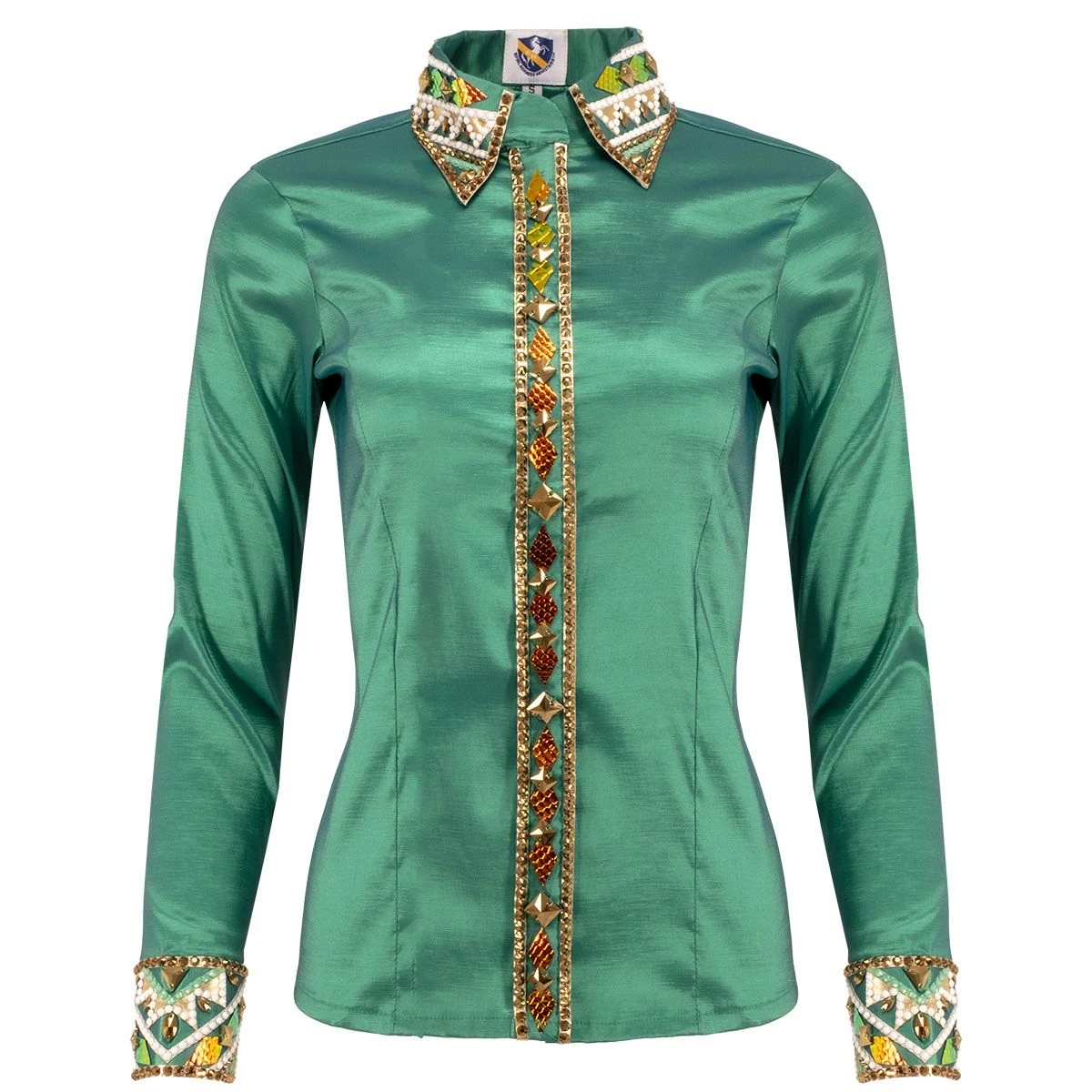 The Kendall Taffeta Ladies Western Show Shirt is an economical yet stylish choice for the show ring. The bright teal trendy taffeta long sleeve base is accented with embellishment on the cuffs, front and collar. The hidden zipper ensures a clean look and slim fit without gaping. This shirt is appropriate for many different classes.