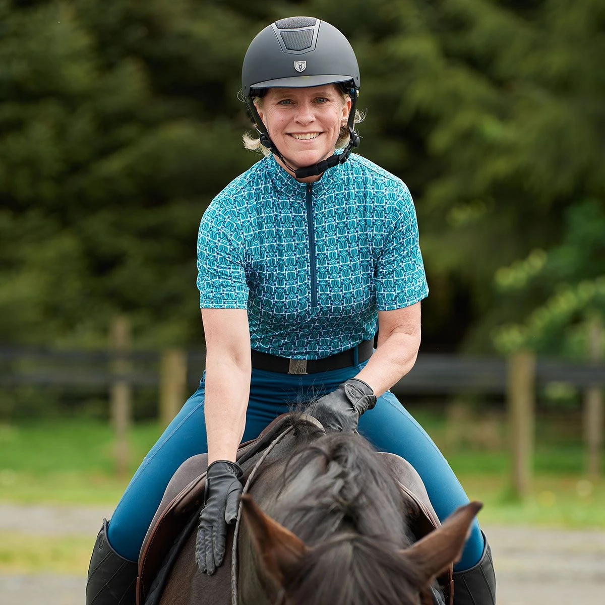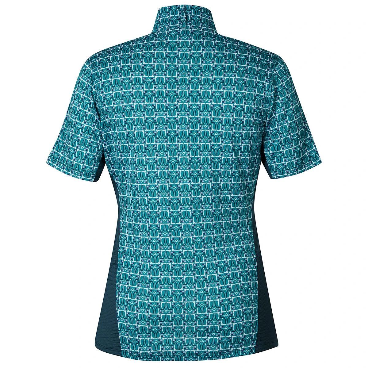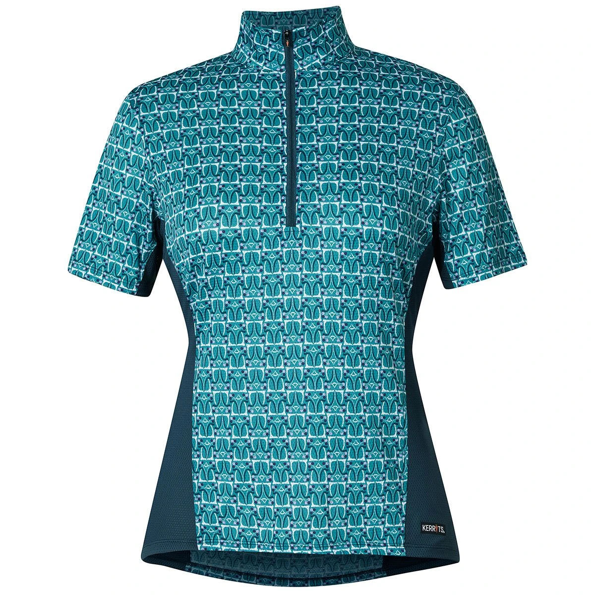 The Kerrits Always Cool Ice Fil Long Sleeve Ladies Quarter Zip has all the Kerrits features you love in a long sleeve version designed for summertime. The Ice Fil fabric cools the skin and is lightweight, breathable and moisture wicking while providing UPF 30+ sun protection. A feminine shape fits and flatters with slimming contrast side panels and a front zip gives the option for extra ventilation. Exclusive equestrian inspired prints camouflage dirt and stains. Two side pockets come in handy for storing sugars.