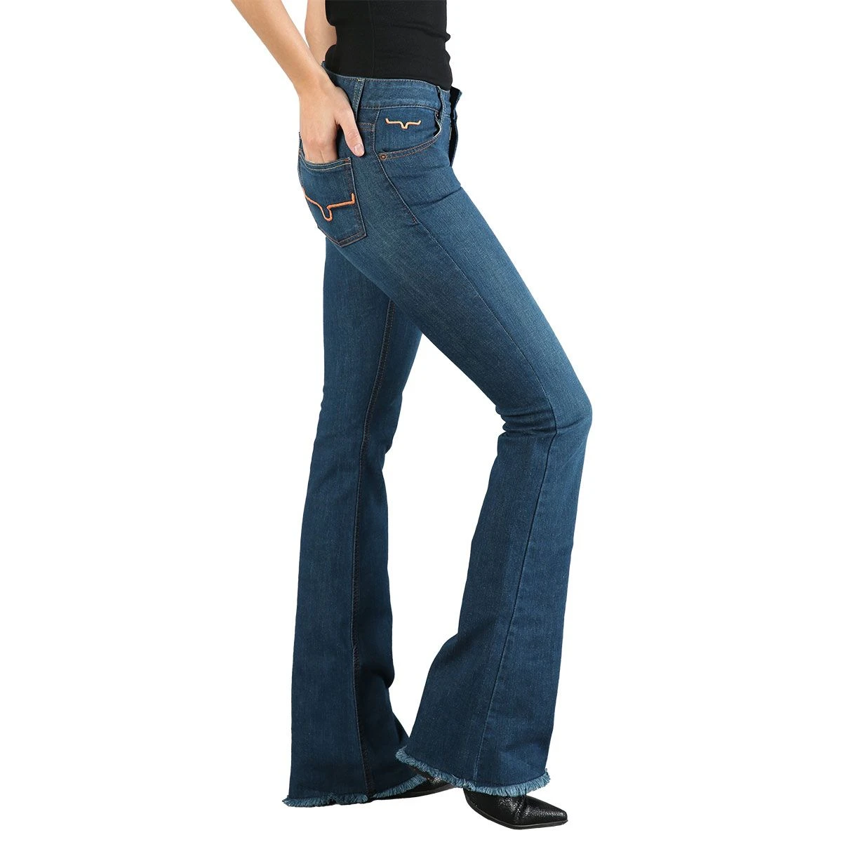 Whether you are enjoying a day in the saddle or a night out on the town, the Kimes Lola Raw Hem Ladies Jeans- Wide Flare will always be your go-to favorites. These jeans have durable cotton blend construction that will allow you to ride, squat, bend, and twist without restriction. The flare leg design with raw edge bottom hem will fit easily over any pair of boots, shoes, or sandals in your closet. Show off your curves to perfection whenever you wear these jeans from Kimes Ranch.