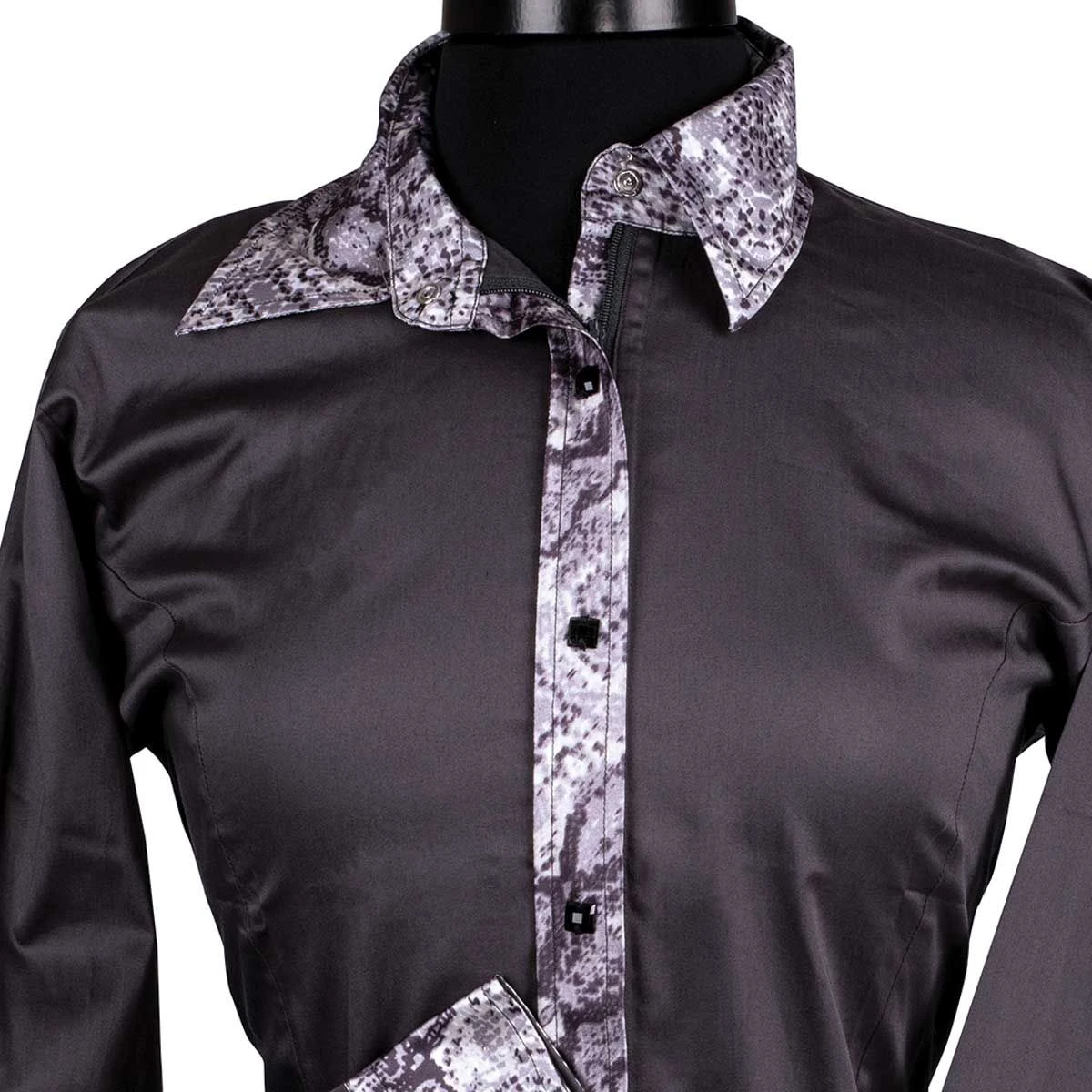 The Lynda Grey Ladies Western Shirt is a classic style button front ladies shirt with a fun dash of patterned color. This faux button front has a hidden zipper for easy on and off, keep your shirt clean and pressed until right before you need it! The shades of grey pattern spreads from the collar, to the button backing to the cuffs. Still a traditional style, but fit your style!