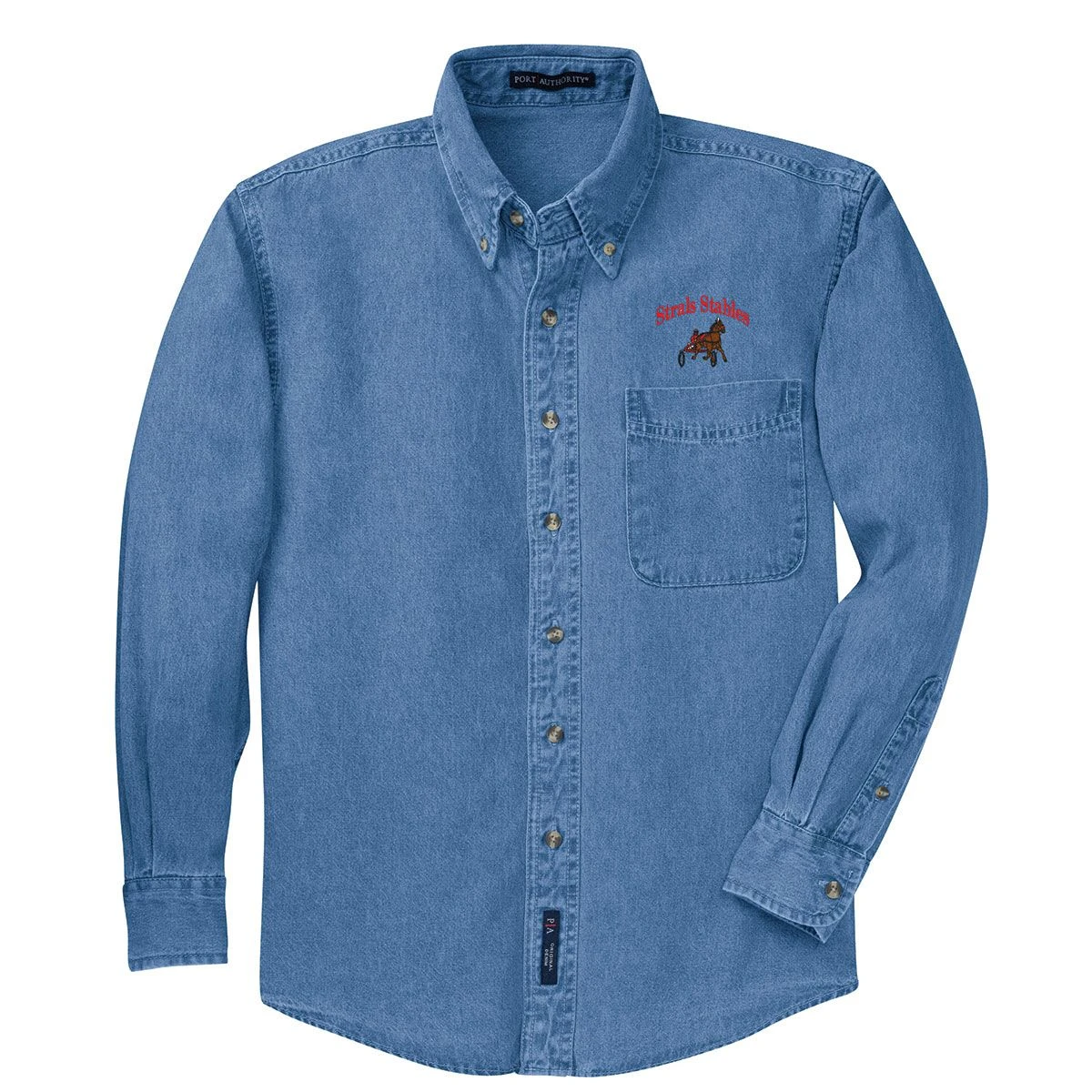 This Denim shirt features 100% cotton denim and double needle stitching and woodtone buttons. Choose from any of our left chest designs with text included. Men’s shirt features a left pocket. Long sleeve.