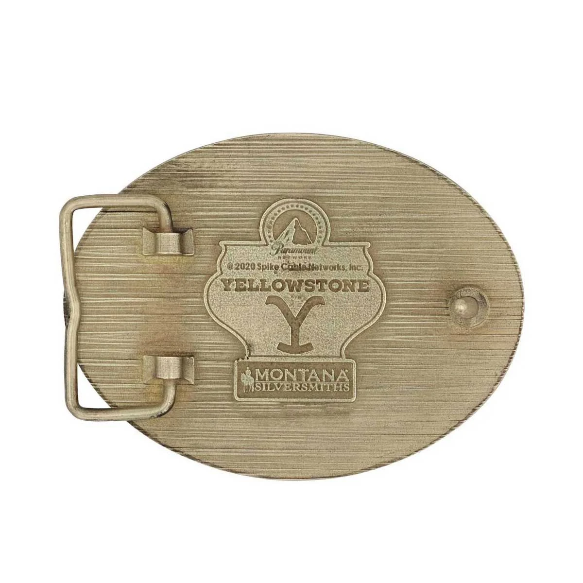 Montana Silversmiths Y Filigree Belt Buckle. Curved oval shape with a gold finish. Dutton Family Y brand is in the center with ornate filigree surrouding it. Bucke has an antiqued look with a rope detail trim. Standard 1.5″ belt swivel.
