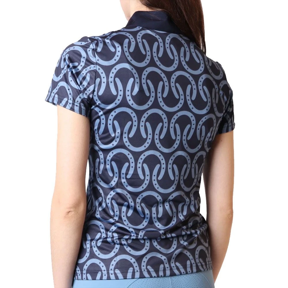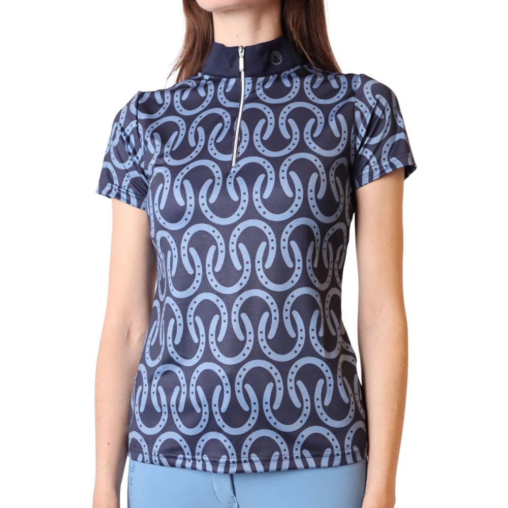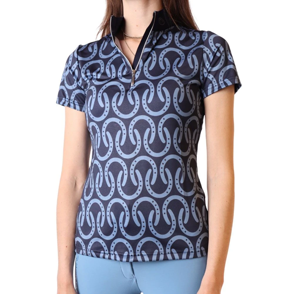The Montar Aisha Short Sleeve Ladies Quarter Zip is made of technical material with a large horse shoe pattern throughout. The short sleeve style is perfect for hot summer days, and the quarter zip gives you options. Feminine and flattering fit, perfect for both breeches and jeans.