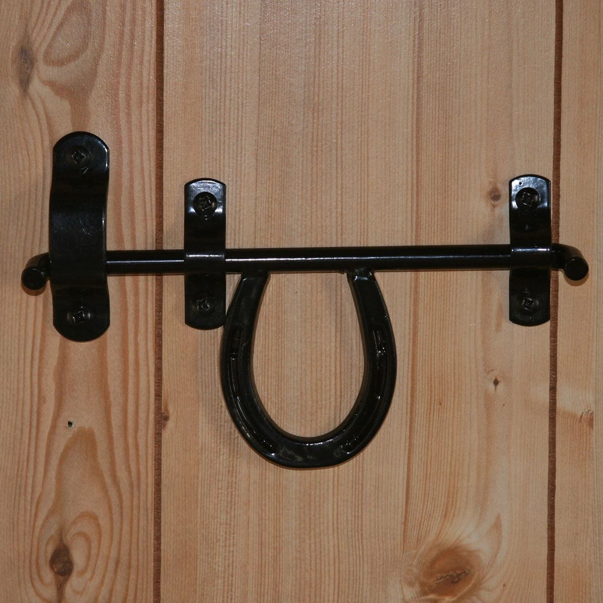 Add a traditional, stylish flair to your barn or stall doors with the Newport Blacksmith Decorative Barn Door Latch. Available in a classic horseshoe or a more decorative horsehead portrait within a horseshoe, either design is hand crafted from heavy duty steel. Designed to fit either left or right-hand doors. Suitable for sliding or swinging doors, the black powder coated finish creates an elegant, timeless look that’s perfect for any hobby farm or AAA-level show or race facility.