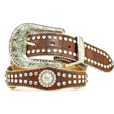 Wow them in the ring with this crystal studded belt by Nocona! ! This great youth scalloped crocodile print belt, is fabulously decorated with rhinestones and rhinestone studded conchos. You will surely be noticed in the ring. Removeable buckle via snap closures.