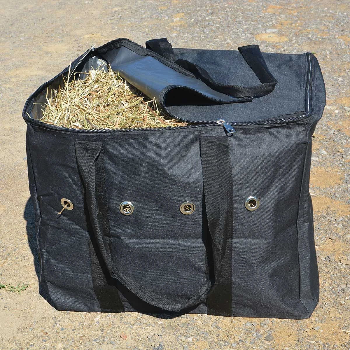 Half Bale Hay Bag – Convenient hay bag makes traveling with your horse even easier. Great for taking on day or overnight trips, no more leaving trails of hay every where you go. 600 Denier bag easily fits an average half bale of hay inside. Features grommet holes on both the front and back sides for ventilation to prevent moisture build up, smooth inner lining also prevents water from seeping in from unexpected weather changes. The sturdy, nylon encased solid plastic bottom keeps its shape, top zip closure provides for easy loading and the two long handles make this bag easy to carry.