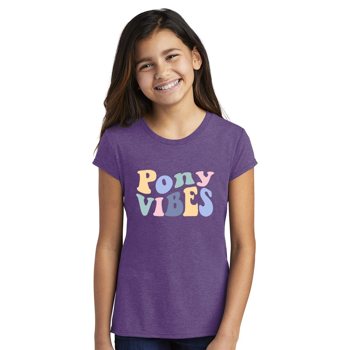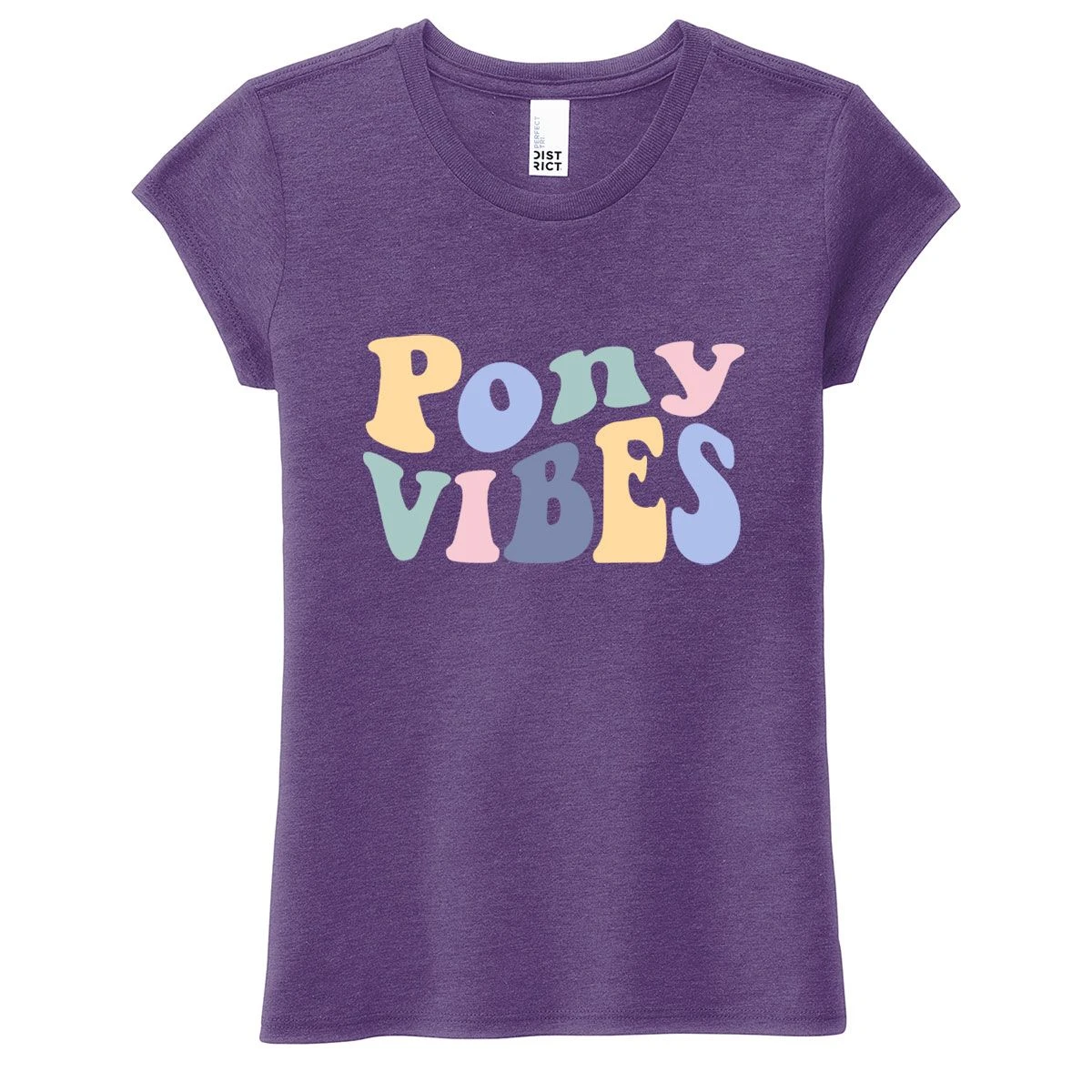 Celebrate your love for horses with this adorable Pony Vibes short sleeve tee. This Youth tee is ideal for summer horse camp, hanging out at the barn or in-between classes at the show. Featuring short capped sleeves and a fun printed Pony Vibes design.