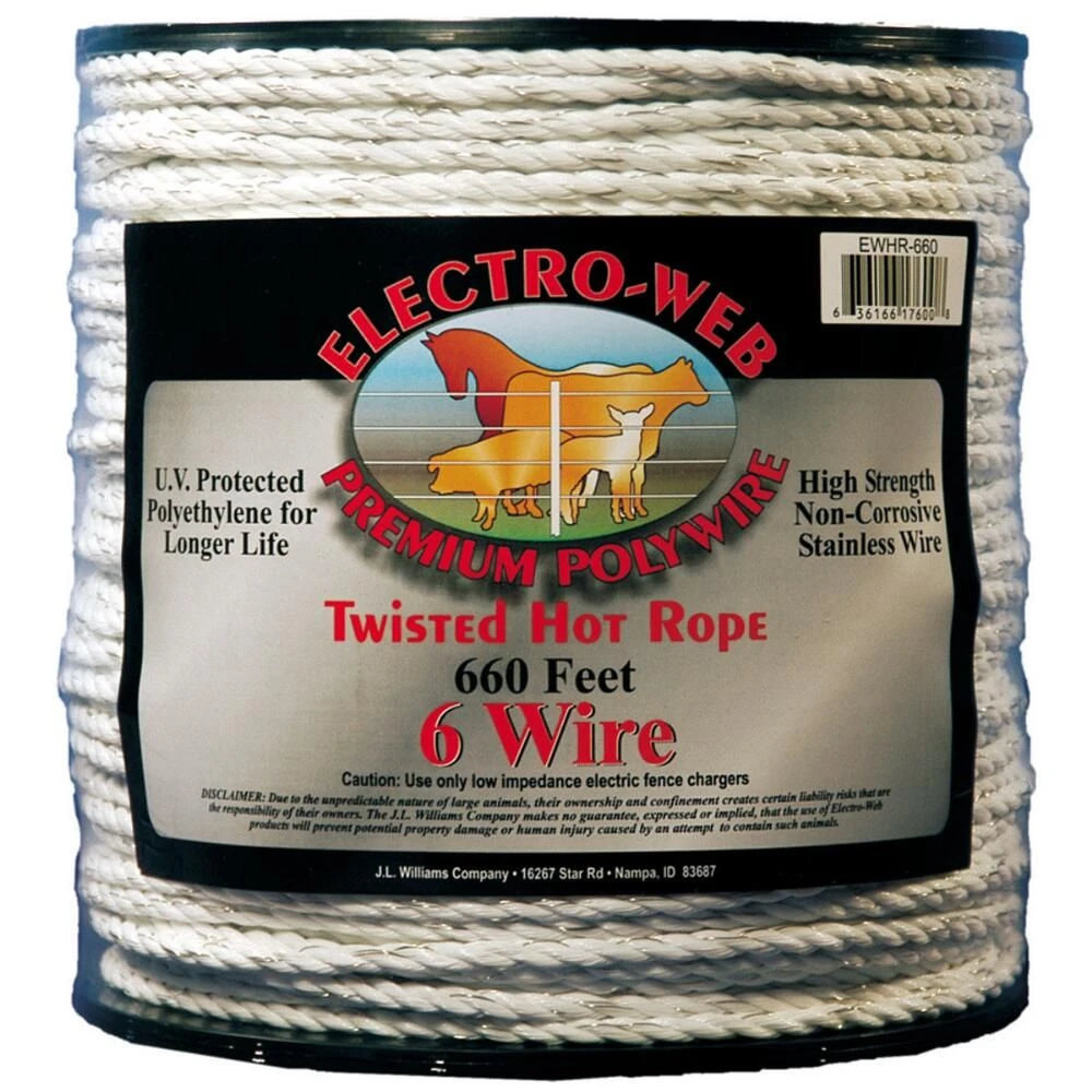 Powerfields Hot Rope braided electric rope features 6-12 mil, heavy-duty, stainless-steel wires twisted around 120 monofilament fibers for a break strength of 600 lbs. Braided electric rope is a popular, very strong and economical containment choice for tough animals and large areas. Providing better visibility than other economy materials, hot rope can be used for permanent or temporary applications.