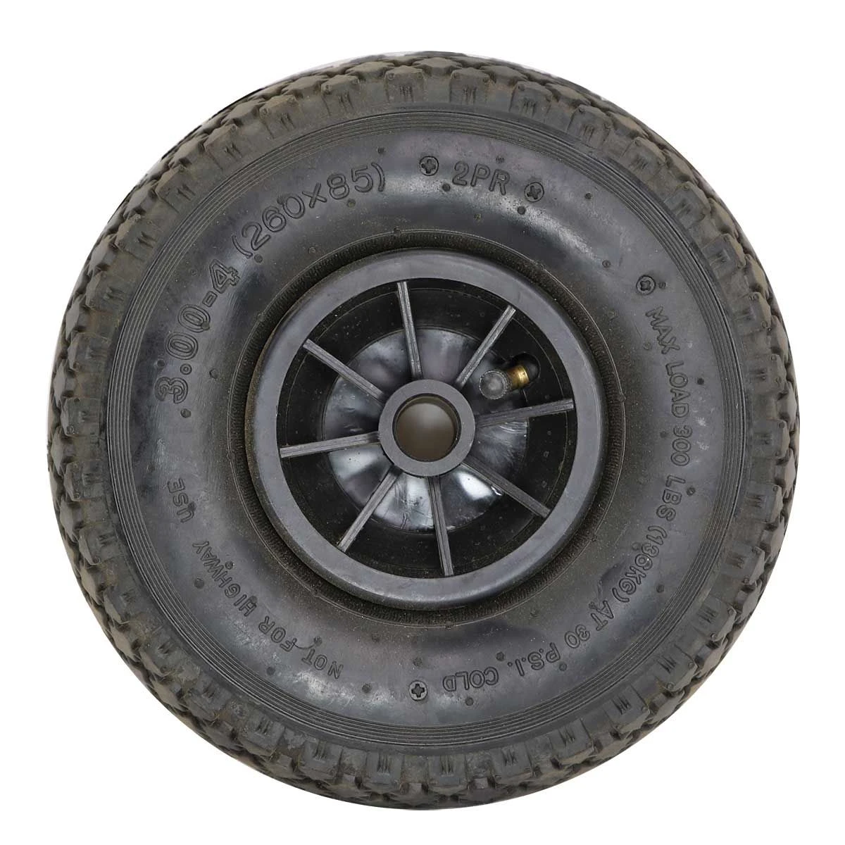 Replacement Tire and wheel for the folding wheelbarrow #6009P. This 10 inch size pneumatic tire easily moves over any terrain needed. Wheelbarrow sold separately.