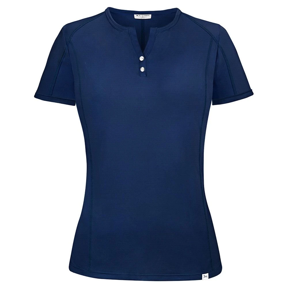 The R.J. Classics Liza Casual Short Sleeve Ladies Shirt is a new style and design from R.J. Classics with a soft feel and comfortable drape. The wicking and stretch fabric has a subtle texture and is cool to the touch to keep you comfortable and protected in the summer sun with its UPF 50 sun protection. The short sleeve tee style has two logo snaps on the shaped neck, and flattering feminine seams. This casual shirt is perfect for all occasions.