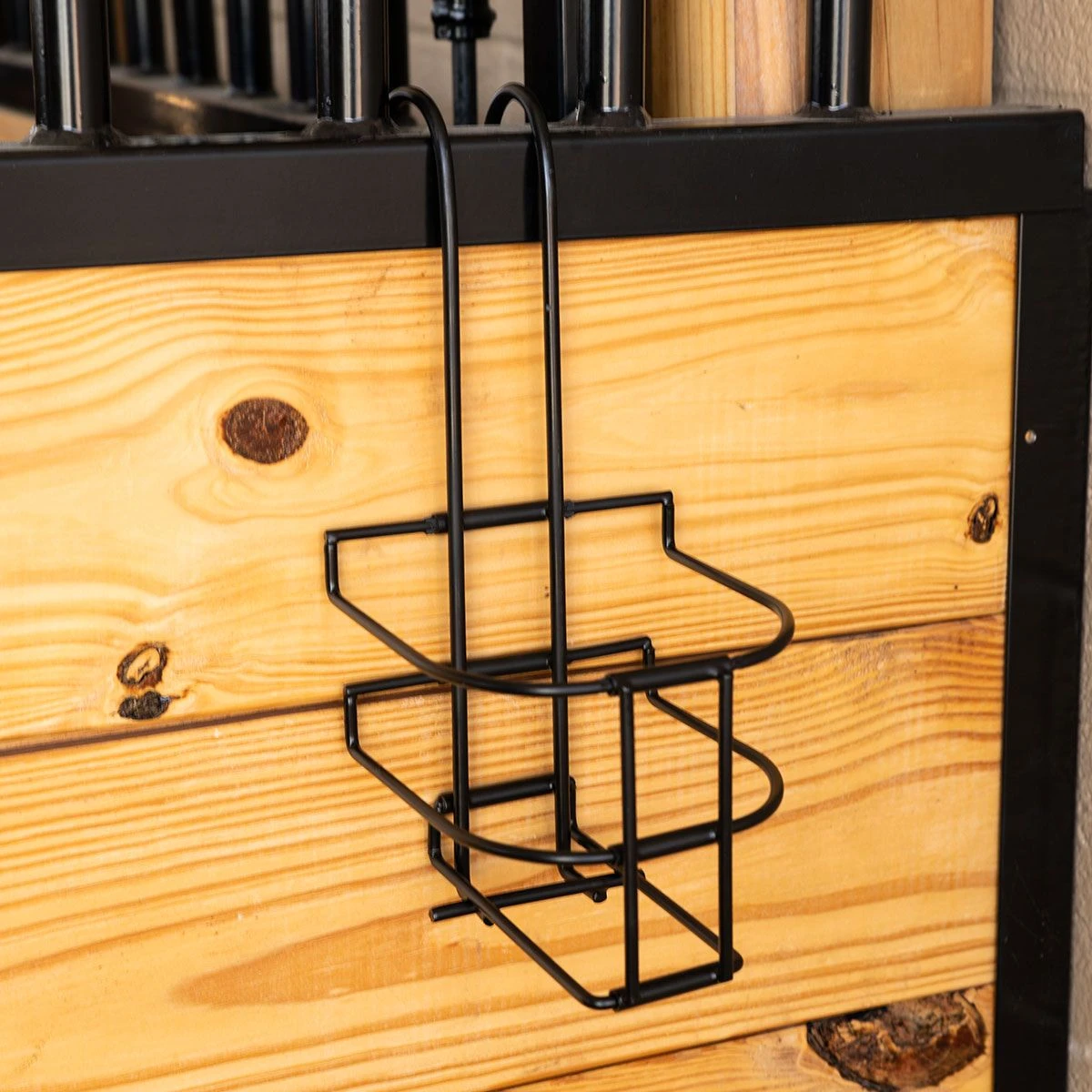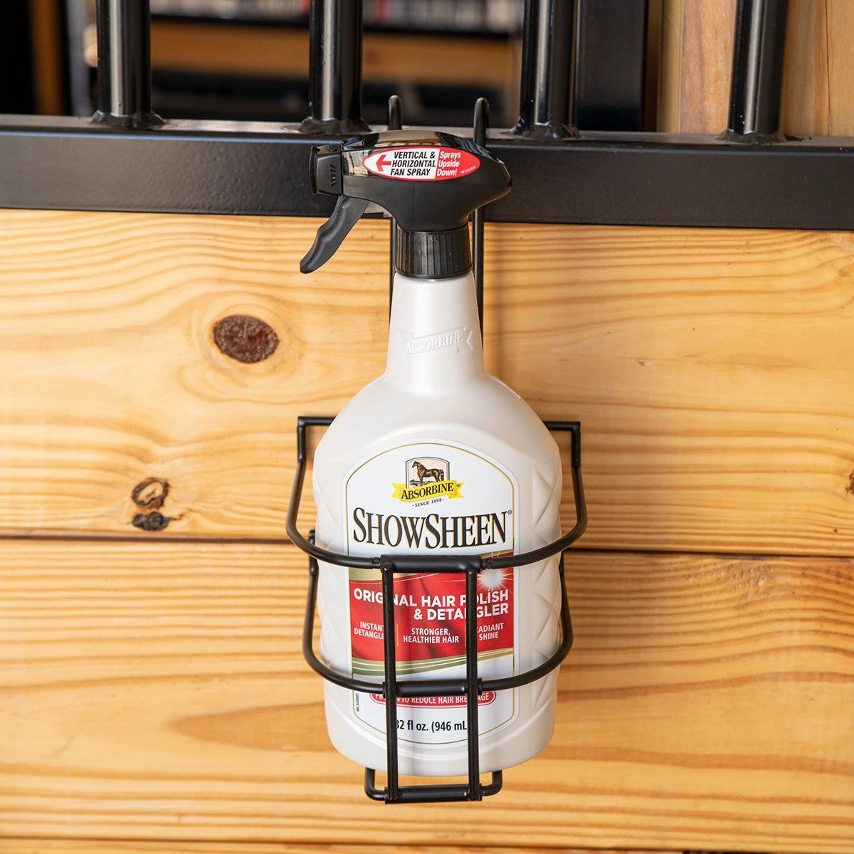 The Tough 1 Collapsible Bottle Holder is a must-have for any barn, trailer, or away at shows. Its space-saving design and sturdy powder coated steel ensured ease of use and many uses ahead. Perfect for keeping any grooming, fly, or medicinal spray close at hand without compromising bottles falling or breaking. Fits easily over stalls, fences, and gates, the convenient plaque on the front is perfect for adding your horse’s name or spray bottle contents. Fits standard wide quart-sized bottle, when a regular round bottle holder won’t do. Imported.